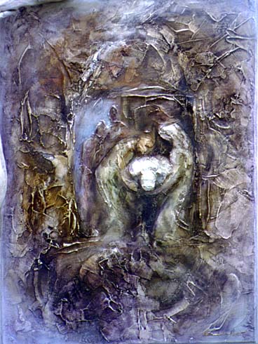 This exhibit of the Stations of the Cross (entitled The Root of Faith) works for us in a way much like reading the Gospels in the context of our time. A set of fifteen mixed media paintings, 25" by 31", oil, texture and drift wood on canvas panel, rustic frame, including The Crown of Thorns, 25" by 35", drift wood on canvas. The theme, The Root of Faith, is a reflection of our journey in faith. The roots used in the frames of these paintings were taken from the banks of the Rappahannock River where we now reside.