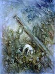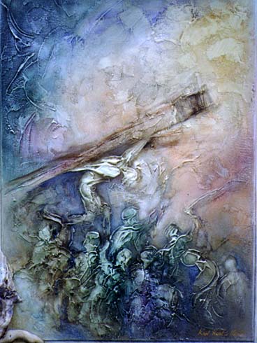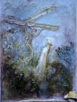 This exhibit of the Stations of the Cross (entitled The Root of Faith) works for us in a way much like reading the Gospels in the context of our time. A set of fifteen mixed media paintings, 25" by 31", oil, texture and drift wood on canvas panel, rustic frame, including The Crown of Thorns, 25" by 35", drift wood on canvas. The theme, The Root of Faith, is a reflection of our journey in faith. The roots used in the frames of these paintings were taken from the banks of the Rappahannock River where we now reside.