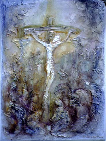 This exhibit of the Stations of the Cross (entitled The Root of Faith) works for us in a way much like reading the Gospels in the context of our time. A set of fifteen mixed media paintings, 25" by 31", oil, texture and drift wood on canvas panel, rustic frame, including The Crown of Thorns, 25" by 35", drift wood on canvas. The theme, The Root of Faith, is a reflection of our journey in faith. The roots used in the frames of these paintings were taken from the banks of the Rappahannock River where we now reside.