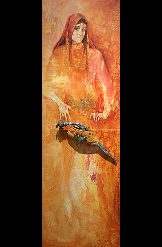 The theme of iconic women who influenced history by their actions is part of every culture. These life-size interpretations attest to the resonance of their stories still. Each painting tells a forceful and insistent story of the impact of a particular woman. The movement of the paint through the background and the figures echoes the action. These women are immediate and vital.